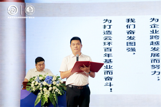 江蘇分公司總裁習陽(yáng)引領(lǐng)宣讀企業(yè)誓詞后,河南云環(huán)藥食同源科技研究院院長(cháng)葛婷向與會(huì )人員介紹了公司發(fā)展的新方向、新布局和新建設概況,表示云環(huán)集團將以質(zhì)量求生存、以信譽(yù)求發(fā)展,與大家攜手并進(jìn)共創(chuàng )公司美好未來(lái)。
